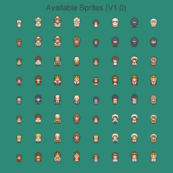 - 4-directionals, 16x32 px (width x height) sprites contained in a 8-character spritesheet ala RPG Maker